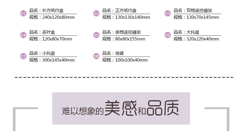 清新,闪亮,时尚 精致工艺,品味 套装展示 商品参数 参数介绍和展示图 8件组合套装 单品的品名和规格 美与品质的结合 彩贝光鲜艳丽 阳光下炫彩夺目 米白色搭配彩贝组合的图案形状,时尚华丽 经典的亚克力材质,环保安全 单品底部设计防滑 耐用持久 外观精美设计 亚克力与彩贝的搭配,眼前一亮 产品展示 方形和长形纸巾盒 不同用途的单品展示 时尚优雅的它给你彩虹的光芒