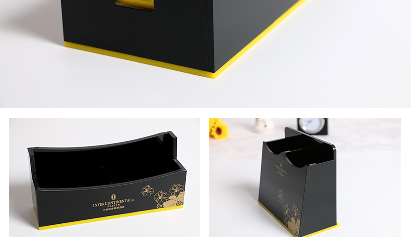 黑黄撞色亚克力套装 简约时尚的套装 色泽鲜艳 参数解说 套装规格的介绍 11件套装的展示图 11件套装品名规格 不放过每一个细节 品位生活,享受生活 纸巾口的细节展示图 材质的特点介绍 边缘边角的细节图 健康环保 花纹纹路,纹理清晰 没有破碎的风险 图片外观设计图片 别具一格的美 展示图片 纸巾盒展示图 方形纸巾盒和长形纸巾盒 遥控器展示 茶叶盒展示 乳液瓶展示 花瓶展示 毛巾托,托盘展示图