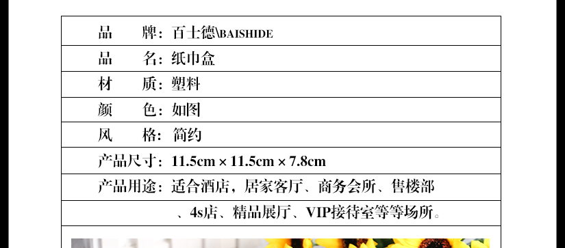 亚克力材质抽纸盒,亚克力材质,耐候及耐酸碱性能好,色彩艳丽、高亮度寿命长,与其它材料制品相比,寿命长三年以上 产品基本信息尺寸的大小维护方便,易清洁,软布擦洗即可 色彩艳丽、高亮度,是其他材料产品不能比美的 可回收率高,为日渐加强的环保意识所认同 专业、时尚防水,耐摔,用起来方便便捷1做工精细,边缘光滑不伤手每一个细节都很精致适用于各种场合黑白搭配,对比度强烈,增加时尚感