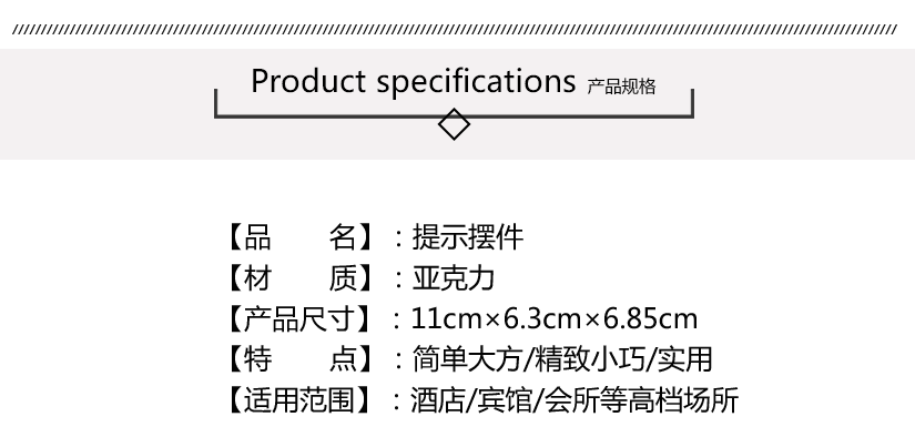 酒店客房晚安牌精湛工艺,尽显品味产品介绍产品尺寸属人工测量,可能存在误差产品细节表面光亮如玻璃,时尚美观底边黑色边缘装饰,简约素雅做工精湛,彰显品质,体现出您对生活的独特追求侧面展示正面展示
